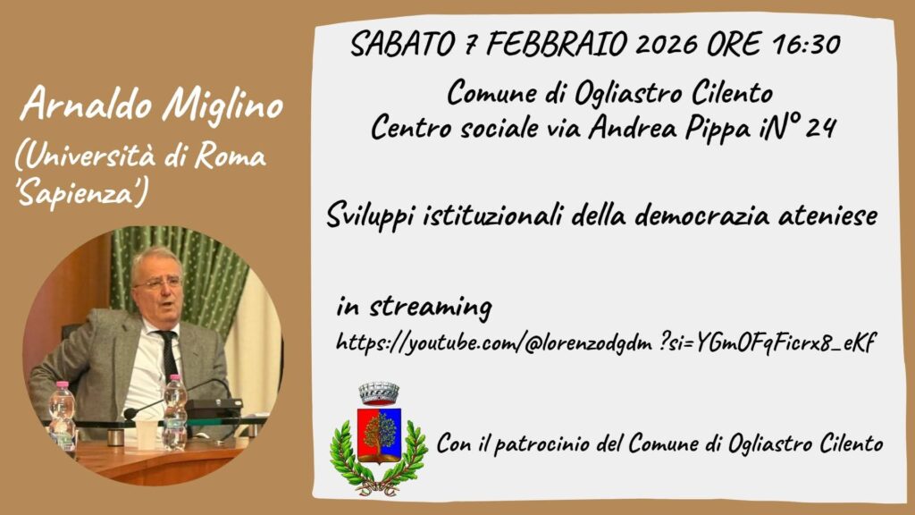 Si svolgerà presso il Centro Sociale polivalente del Comune di Ogliastro Cilento,il terzo degli incontri di formazione civica ideati dal Professore Arnaldo Miglino. Sabato sette febbraio, alle ore 16.30 la lezione dal titolo: “Sviluppi della democrazia ateniese” tenuta da Miglino stesso. La lezione sarà incentrata nel considerare lo sviluppo della democrazia ateniese come un processo graduale, durato due secoli, che ha trasformato la polis da una monarchia a un sistema di autogoverno diretto. Di tutto questo si parlerà sabato prossimo. Gli Incontri di formazione vogliono riportare la cittadinanza attiva e consapevole al centro della discussione politica da troppo tempo abbandonata a se stessa. Tutti gli interessati sono invitati a partecipare. Per ulteriori informazioni, si consiglia di consultare i canali ufficiali del Comune di Ogliastro Cilento