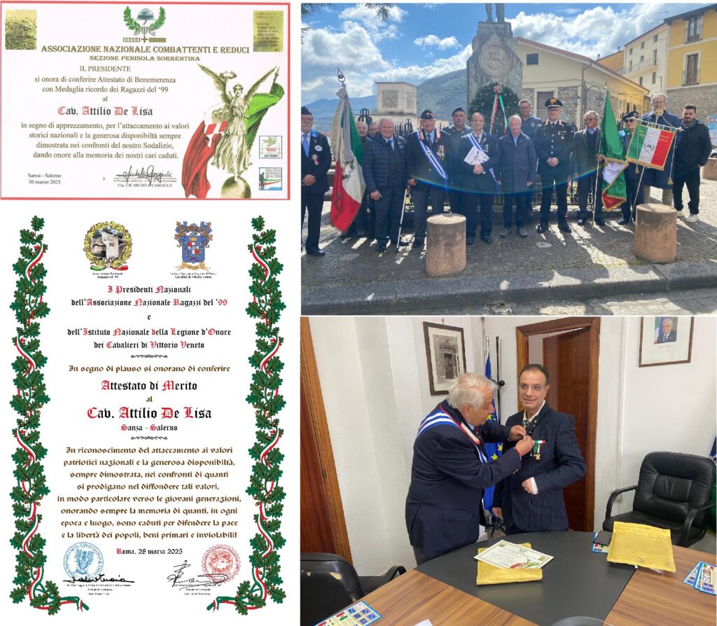 Attilio De Lisa Cavaliere dell’Ordine al merito della Repubblica Italiana di cui onorificenza ricevuta presso la Prefettura di Salerno, il 30 Marzo 2025 presso l’aula consiliare comunale è stato rieletto Presidente di Sezione per il quadriennio 2025 – 2029 di cui unica lista e per alzata di mano all’unanimità votato anche dal Primo Cittadino presente oltre a quella del Cav. Uff. Michele Gargiulo Presidente Regionale Ass. dei Cavalieri di Vittorio Veneto con il Presidente Nazionale avv. Pietro Troìa, Consigliere Nazionale A.N.C.R. e Presidente di Sezione della Penisola Sorrentina di cui delegato dal Presidente Nazionale prof. Antonio Landi per assistere all’avvenuta elezione che ha eletto il Cav. De Lisa Presidente della sezione con sede presso l’edificio polifunzionale comunale in Piazza aviere Angelo Ciorciari (sono stati consegnati al Cav. De Lisa due Attestato di Benemerenza e di Merito con Medaglia ricordo dei Ragazzi del ’99 dal delegato dell’A.N.C.R. e dell’Ass. dei Cavalieri di Vittorio).