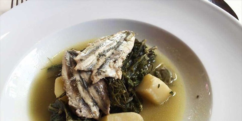 Saute garlic and chopped onions in a deep pan with oil. When brown, lower the heat and add the Menaica anchovy filet, until completely melted. Add the finely chopped fennel, cover with water and bring to a boil, add the potatoes and after 2 minutes chicory and broad beans (both clean and shelled). Cook slowly, having the soup always covered by water. When the vegetables are almost ready, season with salt and add the filet of fresh anchovies. Cook for 5 minutes and serve hot.