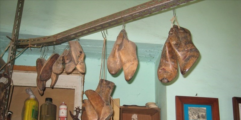 -un bancone, ricoperto per buona parte da una lamiera di ferro zincato, sulla quale si procedeva al taglio del cuoio e della “vacchetta” (pelle di vacca conciata). Tale bancone funzionava, essendovi posata su anche una bilancia a due piatti, per la vendita di chiodi e degli altri articoli. Tra i clienti abituali, tre giovani (allora) “scarparielli”, i fratelli Milo, due dei quali, superstiti, hanno, ancora oggi, posto in bella mostra, come in un museo, nell’ultima bottega occupata, sita allo stesso Corso Vittorio Emanuele, poco prima del campanile, attrezzi, vecchie scarpe, foto di epoca e tante altre cose;