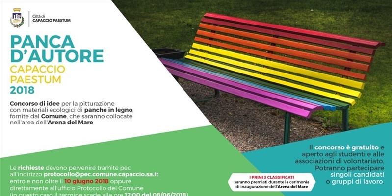 Un’idea grafica originale e innovativa per realizzare le panche in legno che saranno installate nell’area dell’Arena del Mare. Nasce con questo fine il concorso artistico denominato “Panca d’autore Capaccio Paestum 2018”, finalizzato alla colorazione di panche in legno, fornite dal Comune di Capaccio Paestum, con materiali ecologici. Le panche dovranno adattarsi ai normali usi di seduta pubblica e dovranno conciliarsi sia agli spazi interni che esterni. In particolare, saranno impiegate nel periodo che vedrà attiva l’Arena del Mare e nella zona verde antistante la stessa.