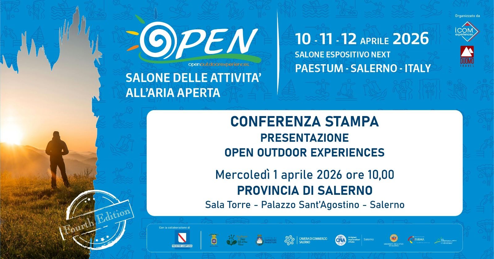 Si terrà mercoledì 1 aprile, alle ore 10.00, presso la Sala Torre di Palazzo Sant’Agostino – sede della Provincia di Salerno – la conferenza stampa di presentazione della IV edizione di Open Outdoor Experiences, il Salone delle Attività all’Aria Aperta in programma dal 10 al 12 aprile presso il NEXT di Capaccio Paestum.