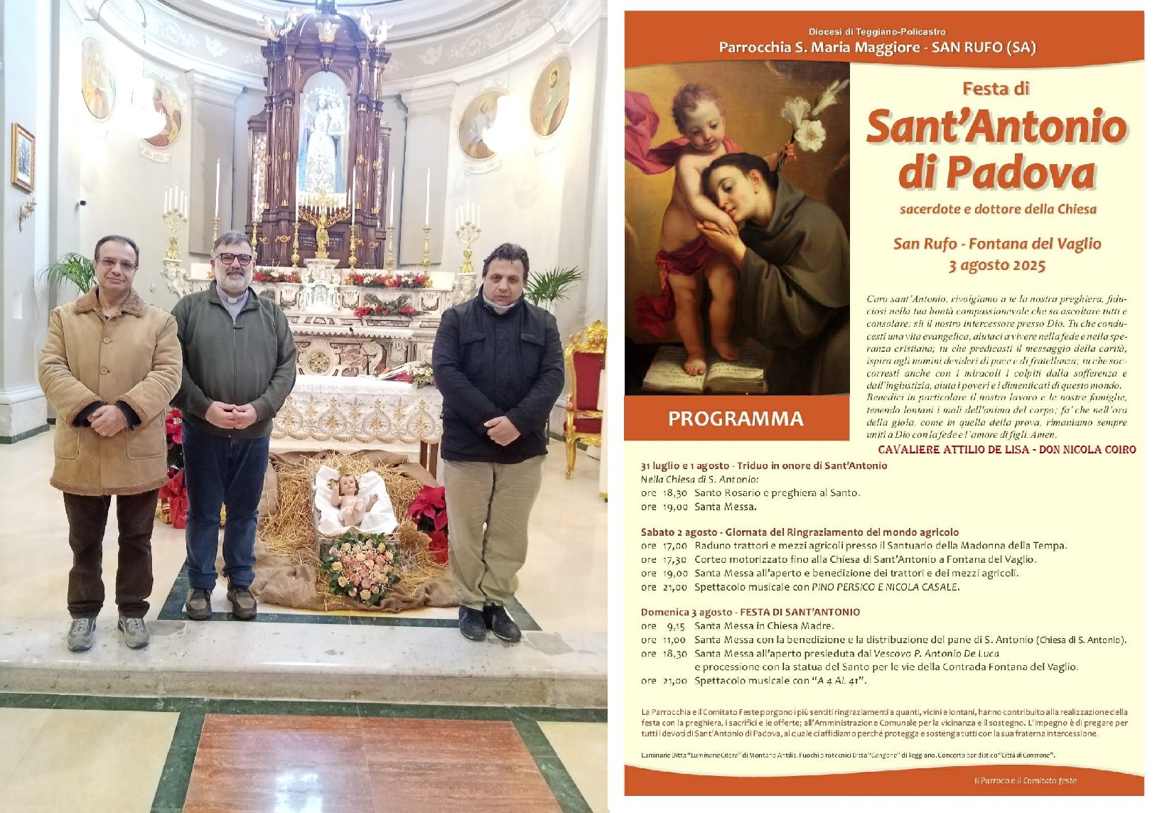 ore 18.30 Santa Messa all’aperto presieduta dal Vescovo Mons. Padre Antonio De Luca e processione con la statua del Santo per le vie della Contrada Fontana del Vaglio.