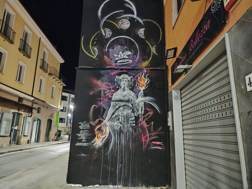 Nella giornata del 15 luglio, in via Gioacchino Murat, cuore pulsante del centro cittadino, l’artista torinese Morb ha realizzato il grande murales ECATE, un’ opera con una dedica a Pantaleo Rinaldi, che ha sempre desiderato un murales proprio in quel luogo.