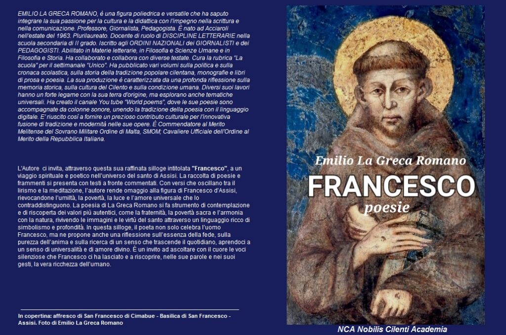 La silloge intitolata “Francesco” (Poesie e frammenti con commenti a fronte), di Emilio La Greca Romano si presenta come un ambizioso e complesso poema corale, un tributo poetico e spirituale alla figura del poverello d’Assisi, ma anche un’esplorazione profonda dei valori, delle virtù e delle contraddizioni che egli incarna. Attraverso una tessitura di immagini, simboli e riflessioni, l’autore ci guida in un viaggio che travalica i confini del tempo e dello spazio, mostrando la rilevanza eterna di Francesco d’Assisi come modello di povertà, umiltà e amore universale. Il testo si configura come un mosaico di strofe che si intrecciano in un crescendo di intensità, dove il senso religioso si fonde con un lirismo esistenziale, rendendo la figura del santo non solo un punto di riferimento storico, ma anche un simbolo di rinascita spirituale e di radicale dedizione all’umanità. La poesia si apre con un’immagine suggestiva dell’ascetica rosata di Assisi, un paesaggio che fonde elementi naturali e spirituali – la roccia, la valle, il profumo di rosa – creando un’atmosfera di sacralità e di eterno ritorno al cuore della povertà e della luce francescana. Emilio La Greca Romano si adopera, con una lingua densa e ricca di metafore, a dipingere Francesco come un essere che trascende le contraddizioni tra mondanità e spiritualità, tra povertà e ricchezza di amore. La sua figura diventa un simbolo universale di fraternità e di ricerca di verità, in cui ogni gesto, ogni parola, assume una valenza liturgica, un ponte tra l’umano e il divino. La poesia si sofferma sui momenti chiave della vita di Francesco: dalla sua nascita e giovinezza tumultuosa, alla vocazione radicale, fino alla sua morte nuda e devota, sottolineando il suo essere “nudo, nuovo Adamo” e “umile scalzo santo servo folle”, figure che incarnano la semplicità e l’estasi del vero essere. Nel secondo movimento, si evidenzia il profondo legame tra Francesco e la natura, tra il suo essere “più italiano dei santi” e il suo ruolo di pioniere dell’umanesimo spirituale. La sua figura si staglia come un “paesaggio di luce”, un pittore che trasforma il colore della tela della Chiesa e del creato, restituendo una visione di rinascita attraverso l’arte dell’umiltà e della carità. La poesia si dilata in un’ode alla sua capacità di elevare l’umano, di trasformare il piombo dell’esistenza in oro di luce, di infondere speranza nei cuori oppressi e di incarnare l’ideale di pace e di perdono. Il testo si arricchisce di riflessioni sulla sua vocazione di povero e sulla sua missione di carità, evidenziando la sua capacità di scendere negli abissi della sofferenza umana, di abbracciare i lebbrosi, di uscire dal mondo per ritrovarsi nel silenzio e nella preghiera, in un continuo dialogo con il divino. La sua figura emerge come un “nudo, nuovo Adamo”, un essere che si spoglia di ogni vanto terreno per vestirsi di purezza e di amore incondizionato. La sua povertà diventa così un atto di rivolta contro l’idolatria delle ricchezze e del potere, una scelta di vita che si fa esempio e insegnamento universale. Alcuni componimenti dell’Autore si presentano come una preghiera‑filosofica che intreccia il lessico della teologia francescana con termini di logica e metafisica, creando un “assioma” poetico in cui la semplicità diventa la chiave di un sapere più alto, una meditazione che trasforma la povertà francescana in un principio logico‑ontologico. L’umiltà, la semplicità e la modestia non sono solo virtù morali, ma strutture fondamentali che rendono possibile la conoscenza del sacro e la partecipazione a una realtà più ampia, dove “la luce che avvolge” è sia metafora che verità ultima. Altri componimenti poetici di La Greca Romano, invece, si rivelano preghiera laica intessuta di parole‑chiave che risuonano come un canto di chiesa antica.