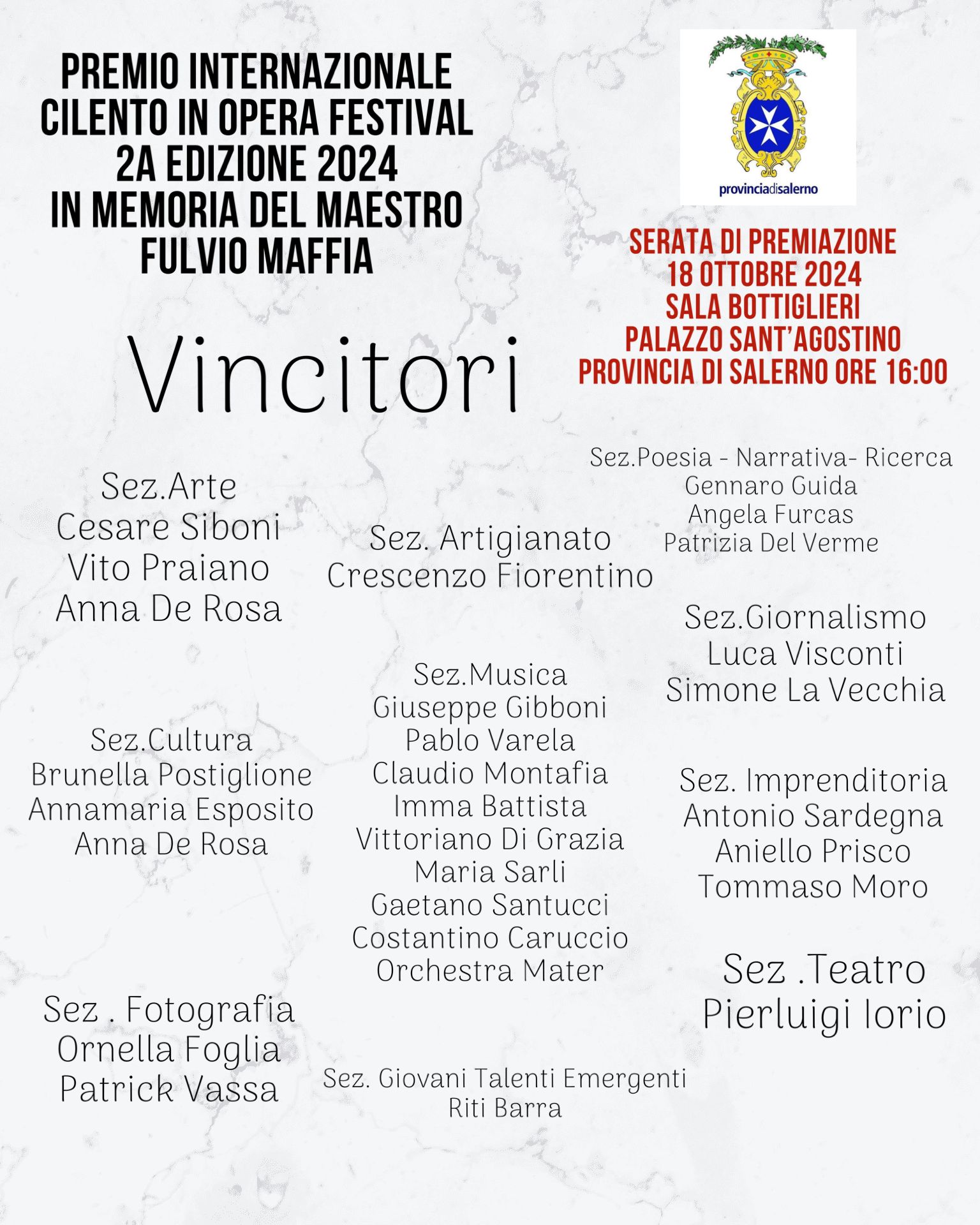 La Cerimonia di Premiazione del Premio Internazionale ” Cilento In Opera Festival” 2 Edizione, in memoria del Maestro Fulvio Maffia, si terrà il 18 ottobre 2024, alle ore 16:00, presso la Sala Bottiglieri del Palazzo Sant’Agostino della Provincia di Salerno.