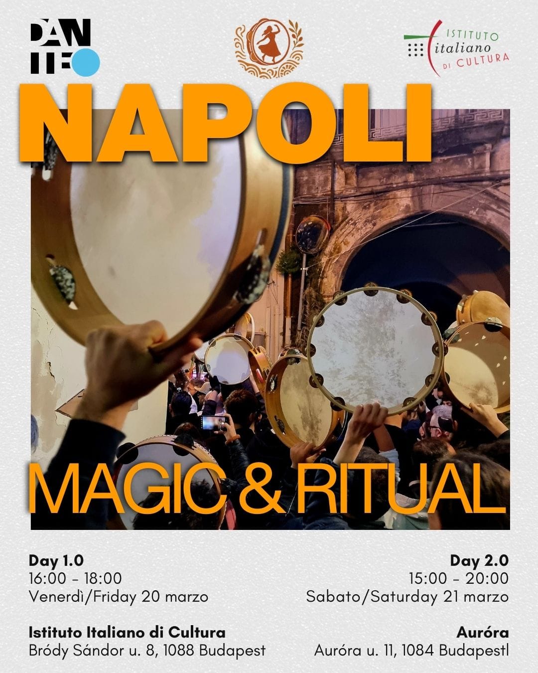 Il 21 marzo, presso Auróra Budapest, il pubblico ha potuto conoscere la cultura popolare campana in un pomeriggio interattivo pensato per tutte le età: una Napoli fa vivere tra esperienza, ritmo, corpo. Il programma ha incluso: narrazioni sulle origini dei riti, dei ritmi e dei movimenti, laboratori di costruzione di strumenti tradizionali (castagnette, putipù, triccheballacche, tammorra), giochi ritmici e attività musicali, workshop di tammurriata con introduzione alla Tammurriata dell’Agro-Nocerino Sarnese, canti tradizionali, danza in cerchio e passi base.