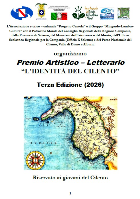 Dopo il grande successo delle precedenti due edizioni, è stato pubblicato il bando dell’ edizione 2026, la terza, del prestigioso Concorso riservato al giovani del Cilento organizzato dall’ Associazione storico-culturale “Progetto Centola” e dal “Gruppo Mingardo-Lambro – Cultura” con il Patrocinio Morale del Consiglio Regionale della Regione Campania, della Provincia di Salerno, del Ministero dell’Istruzione e del Merito, dell’ Ufficio Scolastico Regionale per la Campania (Ufficio X Salerno) e del Parco Nazionale del Cilento, Vallo di Diano e Alburni.