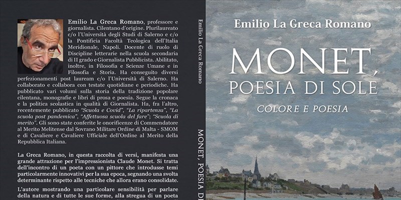 Emilio La Greca Romano, un “poeta impressionista”, così lo definisce il Sociologo Pasquale Martucci nella sua nota introduttiva. “La Greca Romano, in questa raccolta di versi, manifesta una grande attrazione per l’impressionista Claude Monet. Si tratta dell’incontro di un poeta con un pittore che introdusse temi particolarmente innovativi per la sua epoca, segnando una svolta determinante rispetto alle tecniche che allora erano consolidate”. La Greca Romano, professore e giornalista, ha firmato la sua recente raccolta dal titolo “Monet, poesia di sole – colore e poesia”. Il libro è in fase di stampa. Lo pubblicherà la Book Sprint Editore e verrà distribuito anche nei diversi store libri online. Fra questi gli store Mondadori, Feltrinelli, Rizzoli, Libreria universitaria, ibs, uni libro ecc