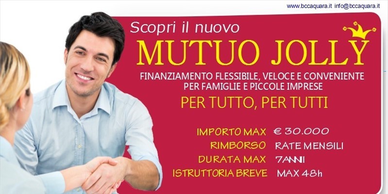 La Bcc Aquara di cui è direttore generale Antonio Marino ha strutturato il Mutuo Jolly in grado di soddisfare diverse esigenze per svariati target. Fino a 30.000 euro di finanziamento a tasso agevolato, da restituire in massimo 7anni, con rate mensili o trimestrali. La prerogativa di questo mutuo? La rapidità di risposta da parte della banca (max 48h) con istruttoria semplificata. Si tratta di un finanziamento flessibile, veloce e conveniente per famiglie e piccole imprese. Per informazioni scrivici su [email protected] o passa a trovarci presso una delle nostre filiali presenti sull’intero territorio di Salerno e provincia.
