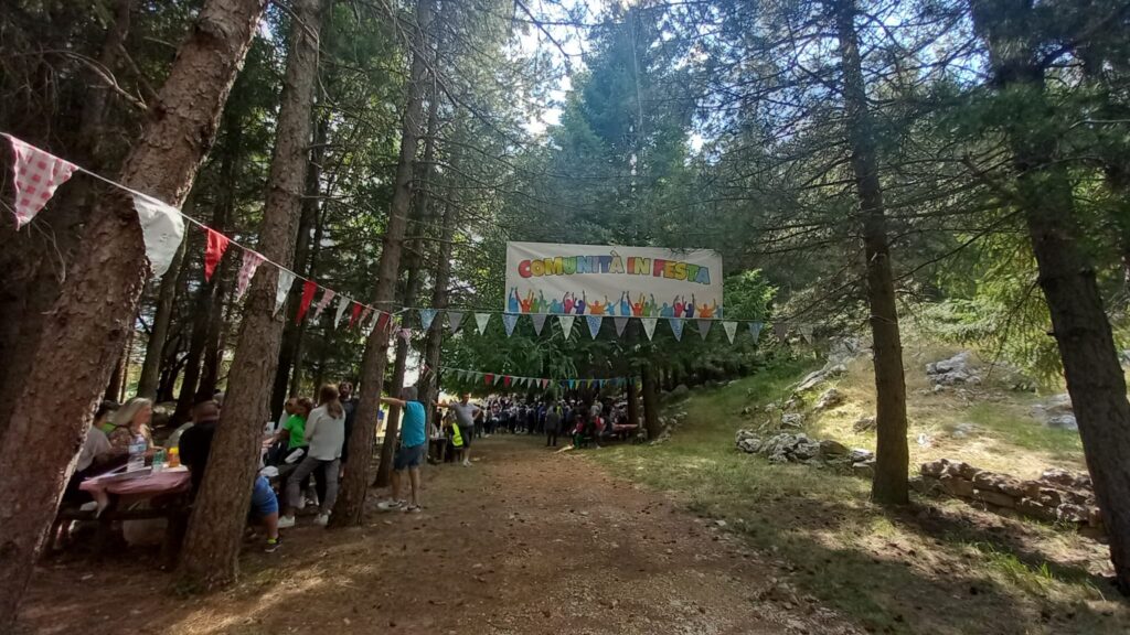 Scendo sul pianoro a salutare i primi arrivati, lo staff che ha già sistemato tavoli e panche per accogliere i “pellegrini” della socialità chiamati a raccolta da don Ernesto. La cucina e il punto informazione è già in piena attività. Le bambine e I bambini, ancora un po’ timorosi, già corrono sull’erba ben rasata.