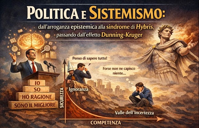 Si, certo, in qualsiasi tempo – anche in quello attuale – abbiamo storia di personaggi politici che hanno, a loro insaputa, questa disfunzione e distorsione della realtà e dei saperi; sia a livello nazionale sia in ambito territoriale. In ogni epoca la politica è stata un campo di battaglia. Istituzioni, norme e decisioni non si limitano a governare, ma modellano e/o dovrebbero modellare la percezione collettiva della società. Ne nasce così un sistema complesso in cui anche dinamiche semplici e apparentemente morali possono alimentare, in alcune figure politiche, la convinzione di possedere una conoscenza superiore rispetto agli altri. Il “sapere aude”, l’esortazione kantiana, ovvero abbi il coraggio di conoscere, ancor prima di tutto, è una tra le più nobili qualità che l’uomo può avere durante il suo cammino sul sentiero della conoscenza. E quindi, l’umiltà di riconoscere i limiti delle proprie competenze; la predisposizione al confronto; saper distinguere cos’è una opinione e cos’altro è la conoscenza e inoltre ma non per ultimo, disporsi e accettare il dialogo, specialmente nella vita politica. La democrazia, la valorizzazione, la crescita e il futuro non prosperano sulla presunzione individuale ma sulla capacità collettiva di argomentare, correggersi quando necessario e apprendere continuamente, anche dalle altrui opinioni e saperi. Allora accentriamoci sul reale significato di Politica e Sistemismo, quest’ultimo inteso come interconnessione impositiva dei valori che caratterizzano correttezza e moralità e non come una sovrastruttura ideologica per legittimare la propria presunzione o arroganza, oppure ancor peggio, intenderlo come “sistema” di tutt’altra natura.