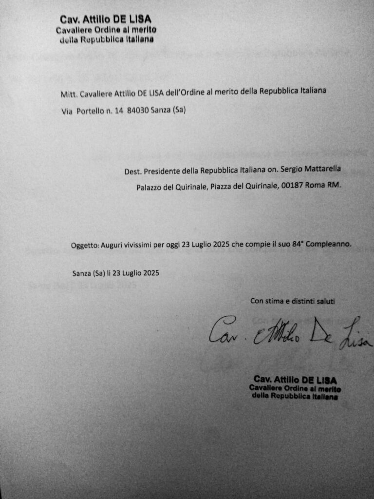 Prefettura di Salerno-Presidenza del Consiglio dei Ministri Governo Italiano: il Cavaliere Attilio De Lisa oggi ha fatto pervenire dal Comune di Sanza in provincia di Salerno della Regione Campania e tramite pec personale gli Auguri di buon compleanno in veste di Cav. dell’Ordine al merito della Repubblica Italiana.