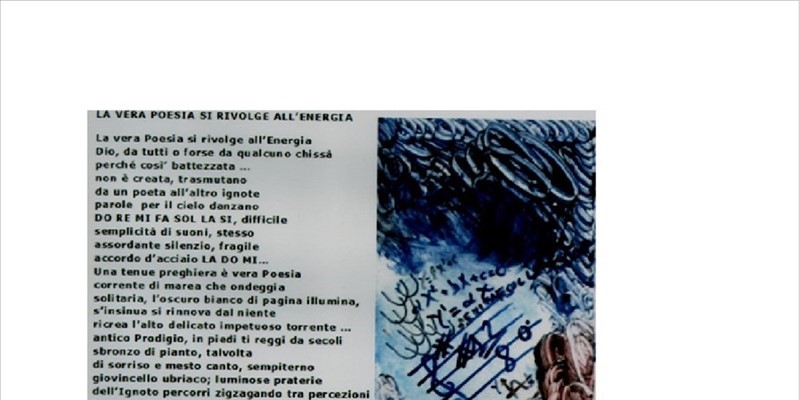 La vera poesia si rivolge all’Energia Dio, da tutti o forse da qualcuno chissà perché così battezzata … non è creata, trasmutano da un poeta all’altro ignote parole per il cielo danzano DO RE MI FA SOL LA SI, difficile semplicità di suoni, stesso assordante silenzio, fragile accordo d’acciaio LA DO MI … Una tenue preghiera è vera Poesia corrente di marea che ondeggia solitaria, l’oscuro bianco di pagina illumina, s’insinua si rinnova dal niente ricrea l’alto delicato impetuoso torrente … antico Prodigio, in piedi ti reggi da secoli sbronzo di pianto, talvolta di sorriso e mesto canto, sempiterno giovincello ubriaco; luminose praterie dell’Ignoro percorri zigzagando tra percezioni tortuose incatenate/liberi versi a mezzavia sospesi tra l’aereo sovversivo e l’antica azione terrena di equilibrata, sana follia.