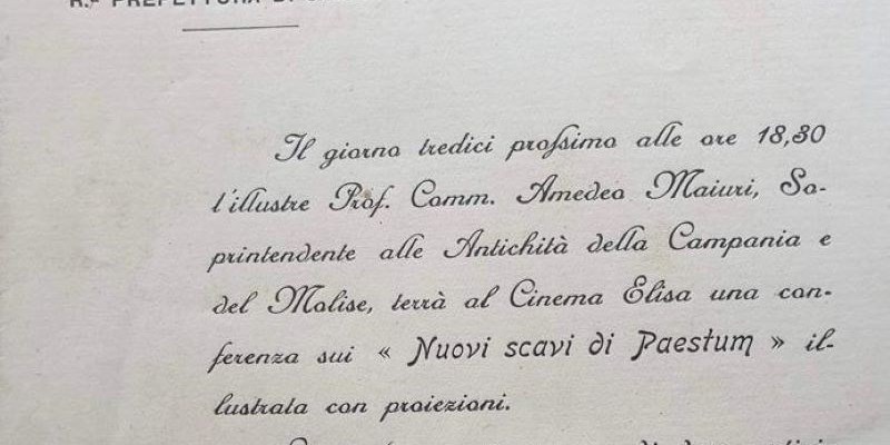 Giugno 1931. Il Prefetto di Salerno invita gli amministratori della provincia salernitana alla conferenza sui “Nuovi scavi di Paestum” tenuta dall’allora Soprintendente, Amedeo Maiuri.