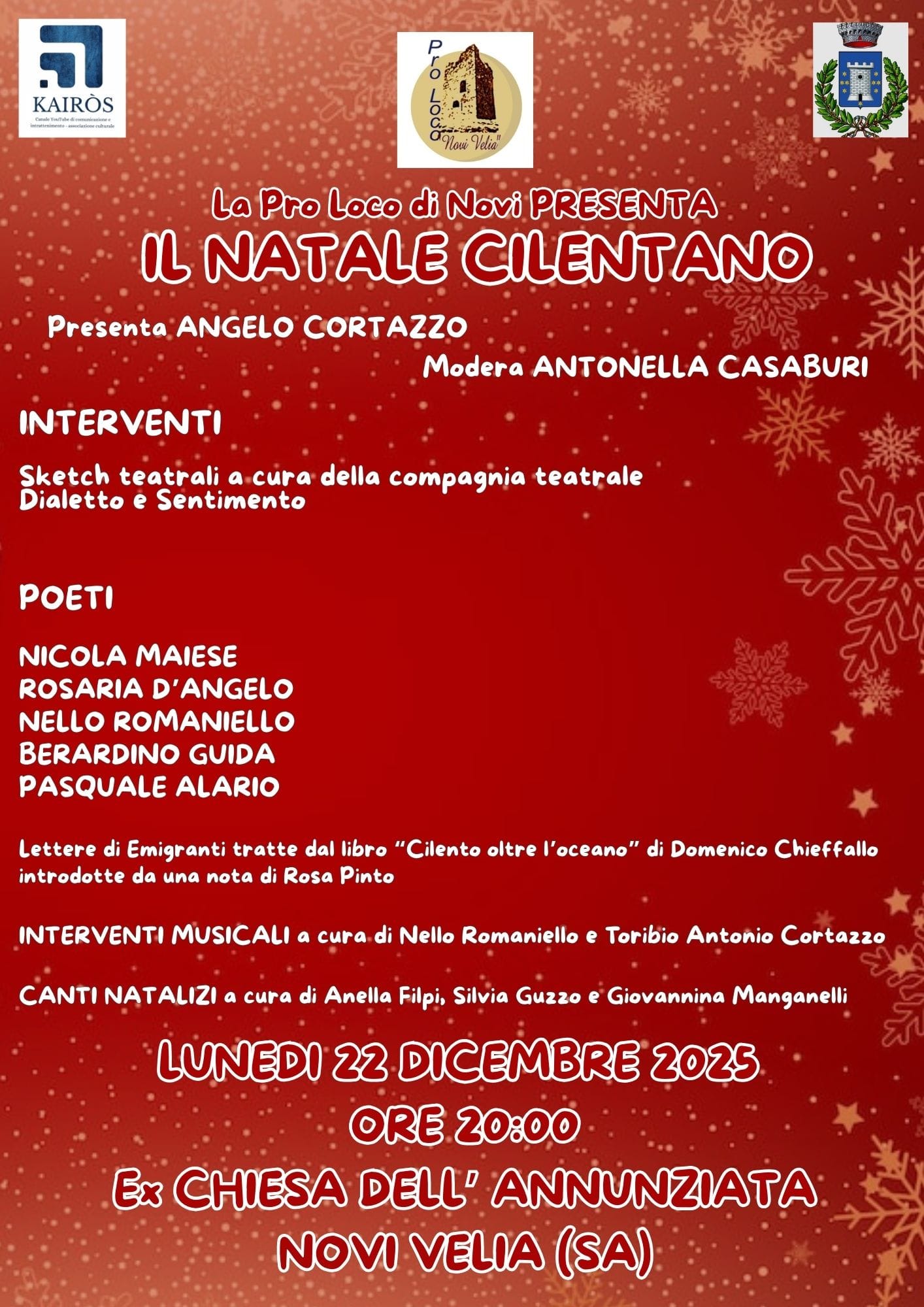 Un pubblico numeroso ed entusiasta ha assistito all’evento natalizio organizzato dalla Pro Loco di Novi Velia nell’ ex Chiesa dell’ Annunziata lunedì 22 dicembre 2025 alle ore 20:00, in cui protagonisti sono stati teatro, poesia, musica e canti tradizionali.
