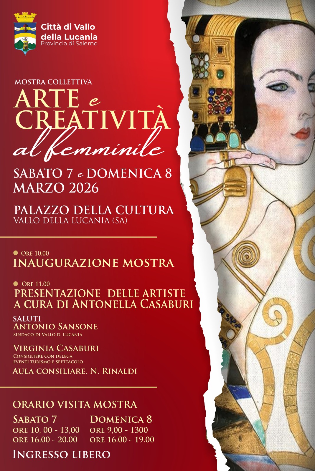 Dopo il grande successo della prima edizione della Mostra collettiva “Arte e Creatività al Femminile”, voluta dal Comune di Vallo della Lucania per celebrare la Giornata Internazionale della Donna, l’ Amministrazione Comunale ha organizzato la seconda edizione della Mostra collettiva “Arte e Creatività al Femminile”. Una seconda edizione che si svolgerà per l’intero weekend di sabato 7 e domenica 8 marzo 2026 nei locali del Palazzo della Cultura, che ospiteranno le opere di artiste locali e non.