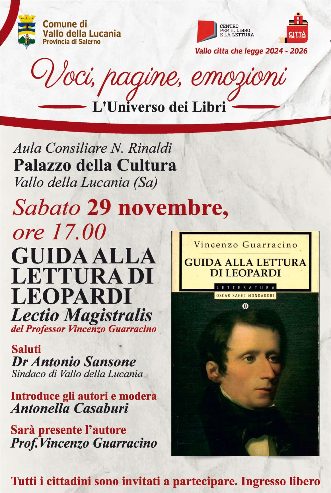 Dopo il grande successo e la partecipazione straordinaria registrata il 15 novembre e il 22 novembre 2025 al Palazzo della Cultura di Vallo della Lucania per la Lectio Magistralis del professor Vincenzo Guarracino dedicata a Giacomo Leopardi e pensata per gli studenti, gli organizzatori della rassegna “Voci, pagine, emozioni – l’Universo dei Libri”, approfittando della disponibilitĂ del professor Guarracino, hanno deciso di offrire al pubblico un ulteriore appuntamento dedicato al Poeta dell’Infinito, sabato 29 novembre alle ore 17.00, rivolto in particolare agli adulti e agli appassionati di poesia.