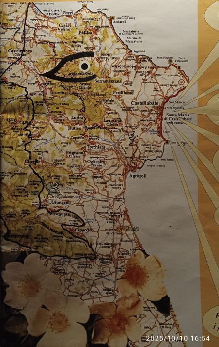 Nella cartina geografica, in questa mia visione personificata, il Cilento richiama, con sguardo attento dal discusso Monte Stella, alle sue bellezze e alle sue problematiche.