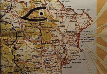 Nella cartina geografica, in questa mia visione personificata, il Cilento richiama, con sguardo attento dal discusso Monte Stella, alle sue bellezze e alle sue problematiche.